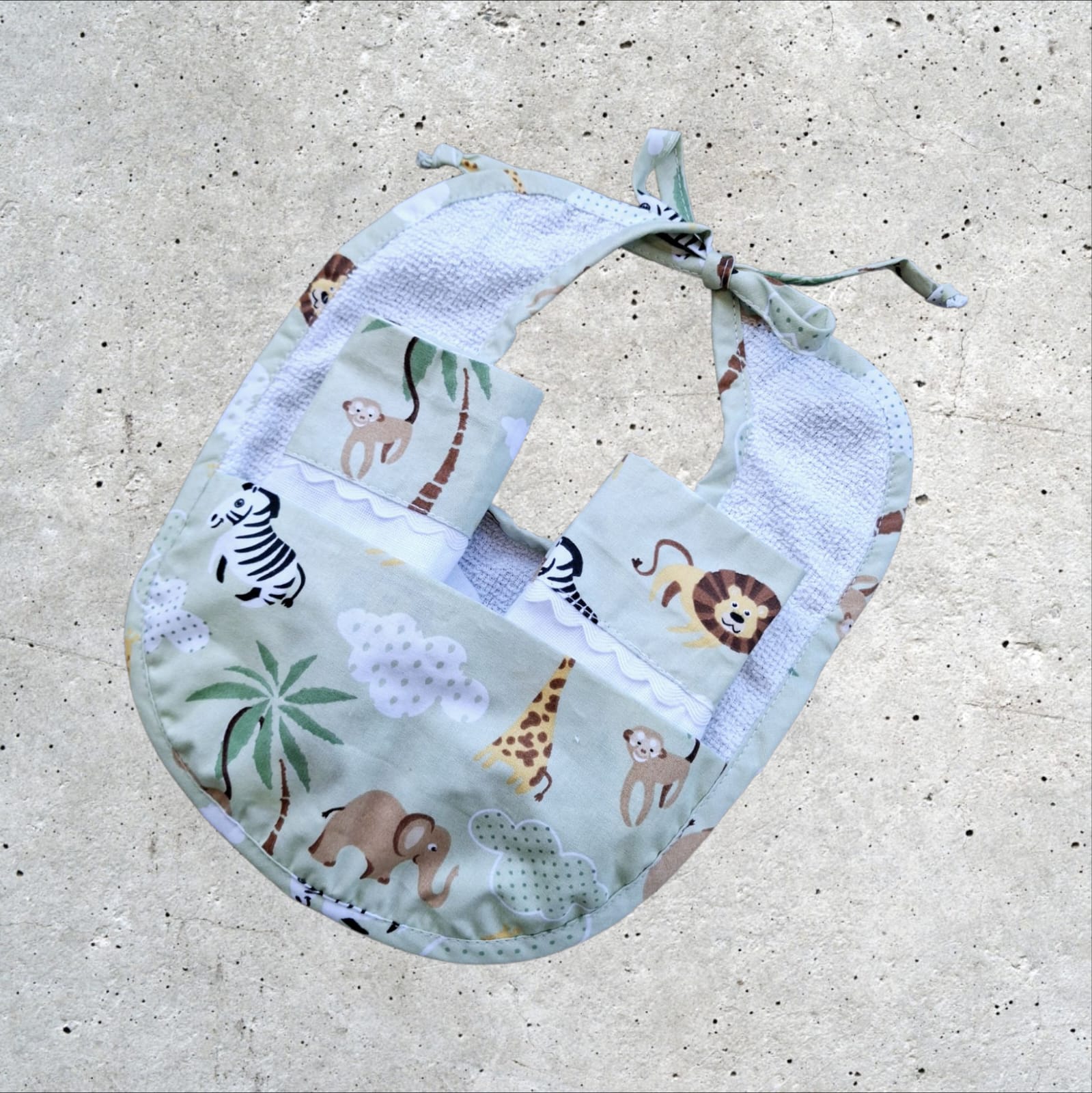 1 babador em tecido felpa atoalhado 100% algodão, cor branca, com bolsinho frontal em tricoline e estampa safari, cor branco com verde. Super fofo!
