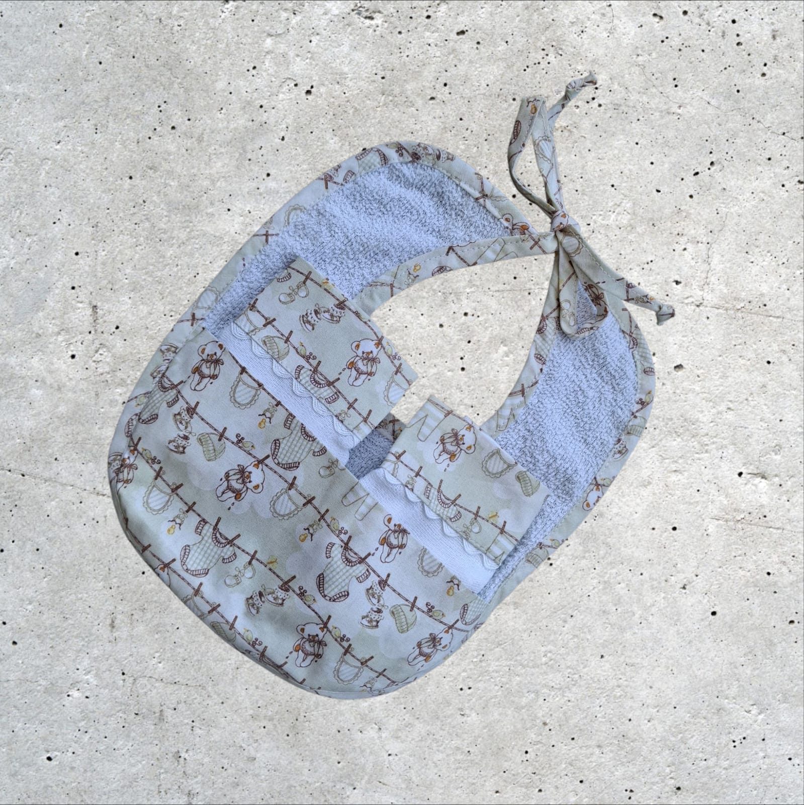 1 babador em tecido felpa atoalhado 100% algodão, cor branca, com bolsinho frontal em tricoline e estampa de varal bege super fofa;