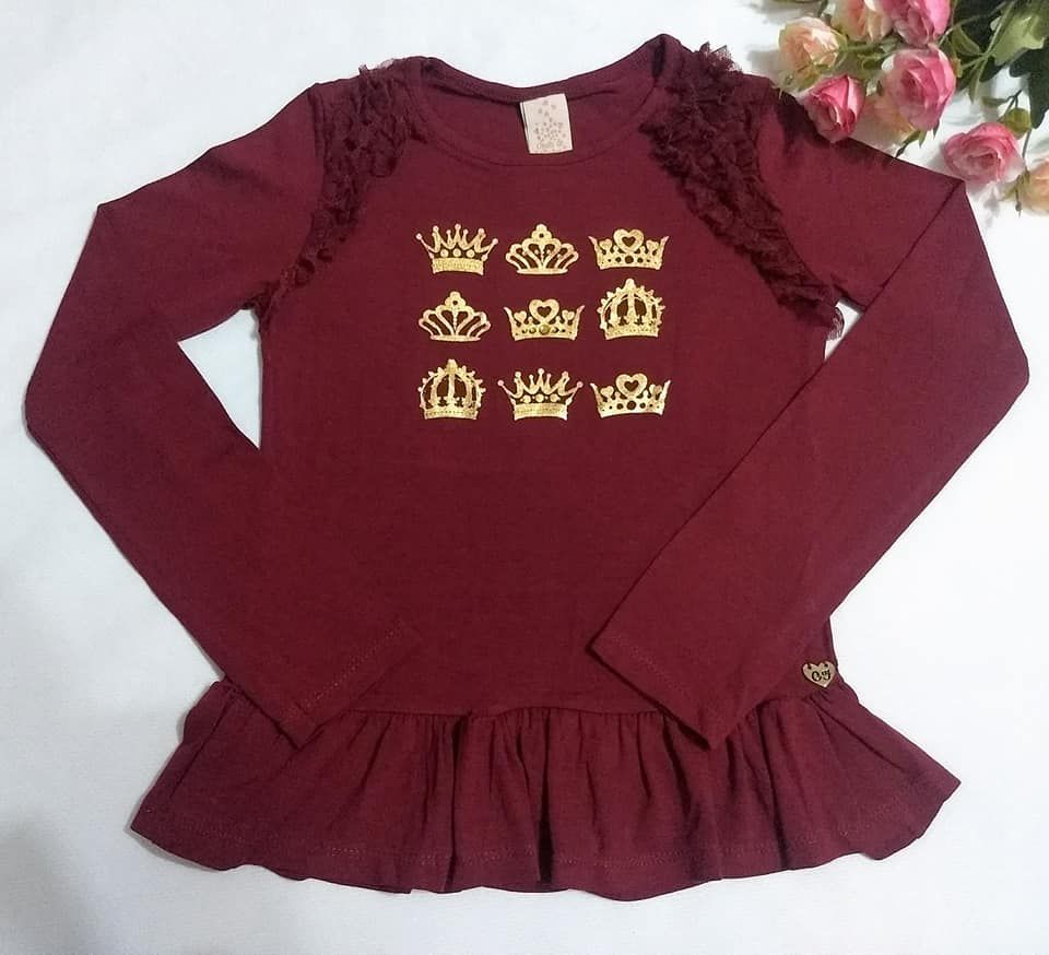 DESCRIÇÃO: batinha manga longa - malha radiosa - cor bordô - detalhe de babadinhos em tule e silk de coroas douradas - babado na barra - tamanhos disponíveis 6 e 8 anos.