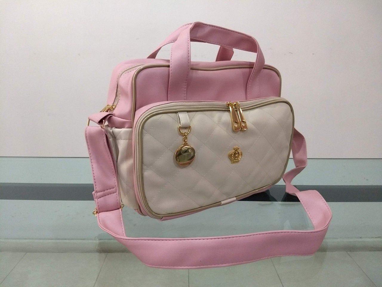 DESCRIÇÃO: bolsa de maternidade - couro emborrachado com detalhes em matelassê - cor rosê com off white - metais dourados com designer moderno - alças de mão e alção regulável - revestimento impermeável - acompanha 1 trocador - excelente acabamento e qualidade - modernidade e estilo