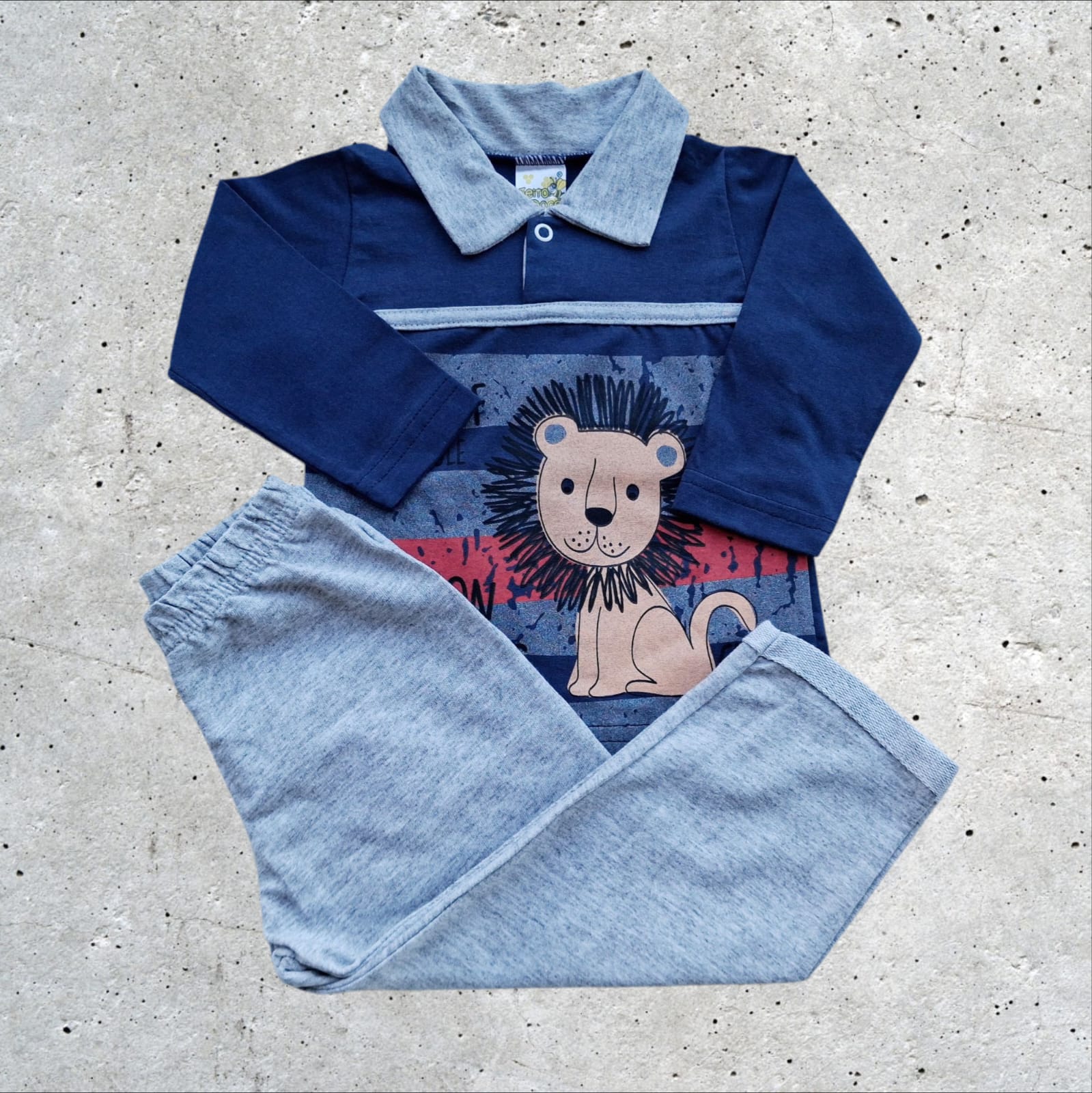 DESCRIÇÃO: conjunto blusa manga longa e calça moletinho - a blusa de cor azul marinho, é confeccionada em malha 100% algodão, tem golinha e um lindo silk de leãozinho e listras na frente. A calça de cor cinza mescla é confeccionada em moletinho, com elástico na cintura e uma charmosa dobra nas perninhas.