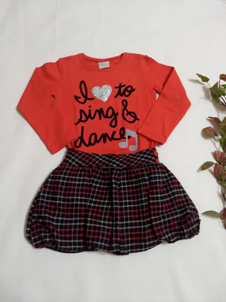 DESCRIÇÃO: conjunto infantil menina com 2 peças - blusa malha manga longa - cor vermelha com silk e aplicação de coração em paetês - saia balonê - tecido flanela xadrez - elástico na cintura.