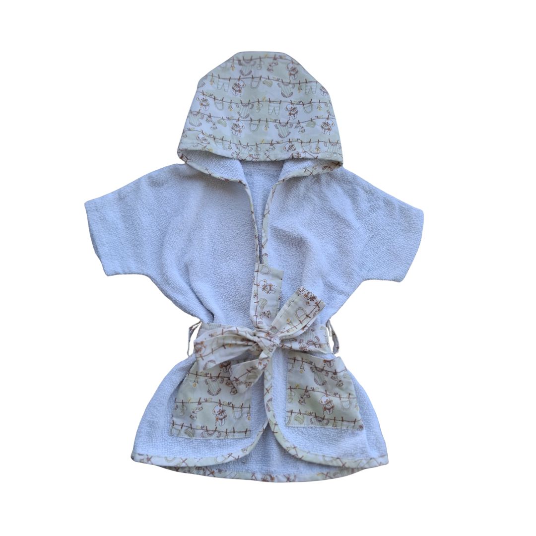 Confeccionado em felpa branca 100% algodão super macia, este roupão envolve o bebê com suavidade e proteção térmica. O capuz, os bolsinhos e a faixa são feitos em tricoline estampado no delicado tema varal em tom bege clarinho, trazendo um toque lúdico e cheio de charme ao enxoval de bebê.